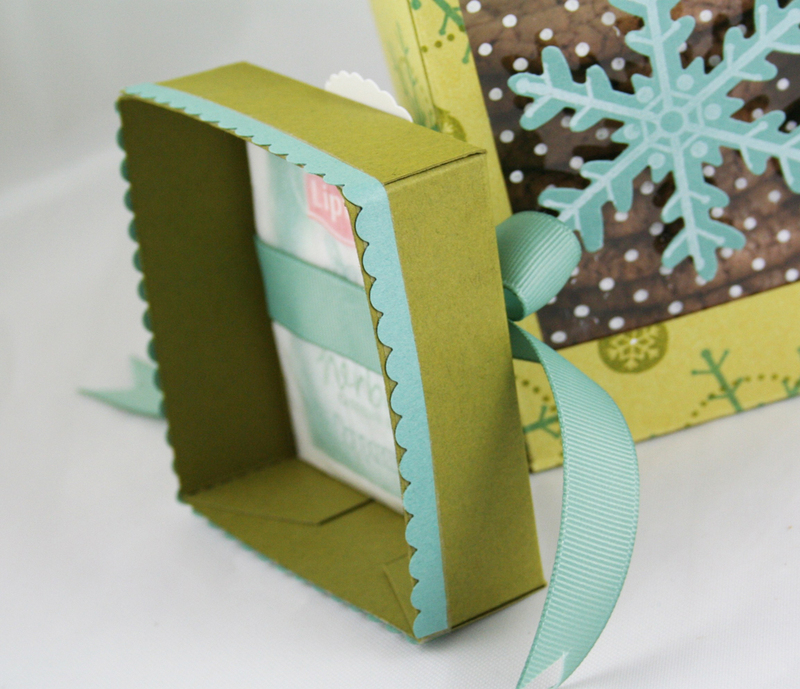 As the tag states, winter has a whole lot of *brrrrrrrr*! Why not put together a little something that will make someone nice and cozy as the curl up on the couch after a long day? Like I explained earlier, the lid of this box was originally designed to hang an ornament from. I used the same feature to hold a bag of tea in place, to go with the chocolate cookie crisps! I found that most tea bags fit perfectly in our small glassine bags.