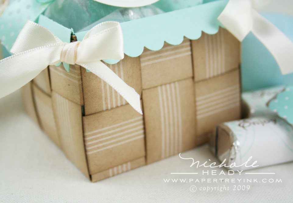 Other: vintage cream satin ribbon, aqua mist swiss dots ribbons, vintage cream button, twine, white labels, scalloped scissors (Fiskars), 2" circle punch (EK Success), organdy bag (from stash), Hershey's Nuggets