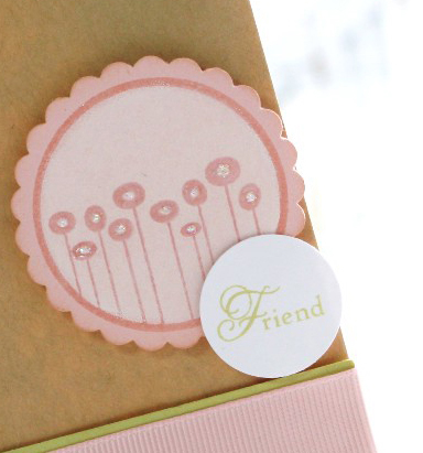 These small "friend" and "enjoy" sentiments (that are included in the new set) are stamped in dark chocolate ink in the center of each label.