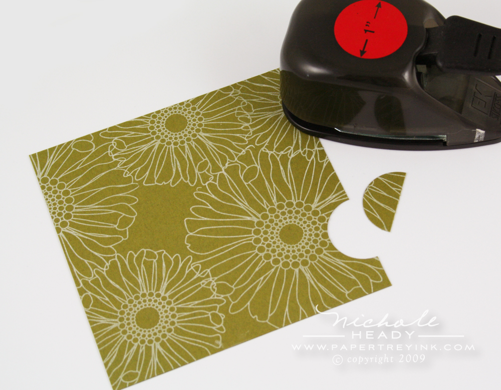 I started by stamping the large and small (yup, there are two sizes folks!) flowers onto ripe avocado cardstock using vintage cream ink. Aren't you just in LOVE?!?!? Honestly, who wouldn't want to stamp that pattern on very shade of cardstock they own! *sigh* I punched a notch from the side of the cardstock using a 1" circle punch (EK Success).