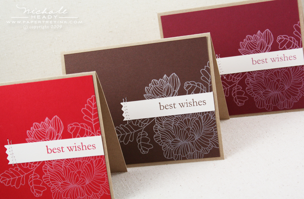 Next up is a project I created without doing any intricate cutting. I pulled three of our darker hued colors (Scarlet Jewel, Dark Chocolate & Pure Poppy) out from my cardstock stash. I then stamped the corners of the blocks with a variety of the images using Vintage Cream ink. I adore how crisply the image turns out when using this ink. Just fabulous!