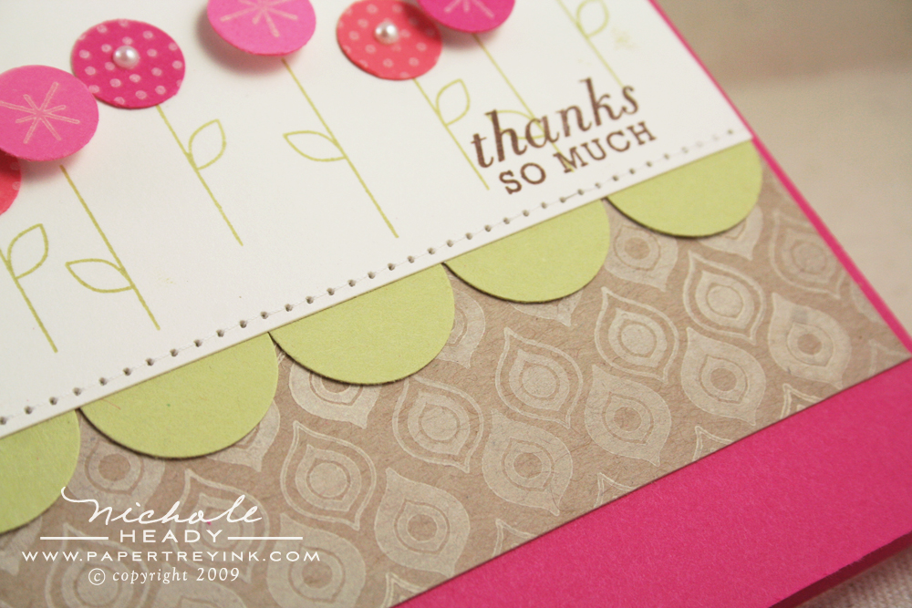 This last card is simple, but oh so stylish. Polka Dot Basics II stamped with Fresh Snow ink makes up the pattern on the right. The left uses a pieced striped pattern that I created myself.