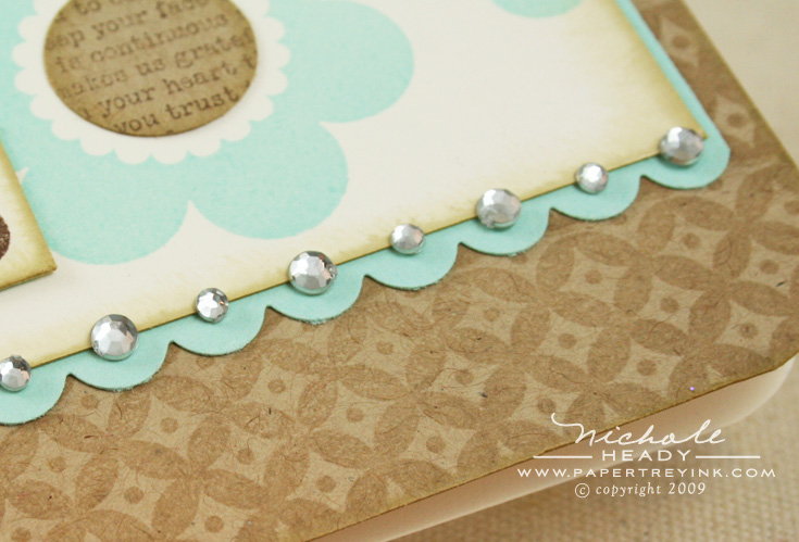 One last closeup from this card… the rhinestone border came out nicely with an alternating medium and small rhinestone pattern. I love the way it creates a lovely transition by placing the rhinestones right on the seam between the cream layer and the scalloped border. I will definitely be doing this again!