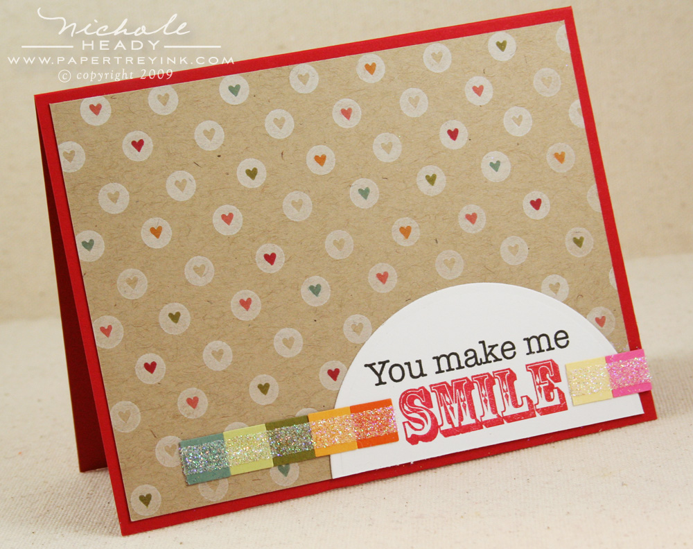 I stamped the Smile sentiment from Dawn's set with Pure Poppy ink, followed by the companion sentiment with True Black. I used one of my Nestabilities Circle dies to cut out the sentiment grouping. After adhering it to the bottom of my card, I trimmed the lower portion of the circle off.