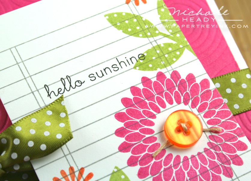 - OTHER: Sunshine Impression Plate, Simply Chartreuse Swiss Dot Ribbon, Orange Zest Vintage Button, Rustic Jute Button Twine, Clear rhinestones (KaiserKraft), foam dimensionals