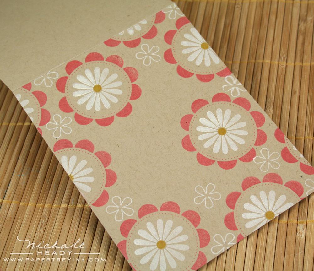 I created the background using Beautiful Blooms II using Berry Sorbet, Vintage Cream & Summer Sunrise inks. One thing I like to try to do when I am stamping on a card cover that I know a large focal point will be added to is stamp the pattern mostly around the edges. This is the only portion that will be visible so keep that as your focus.