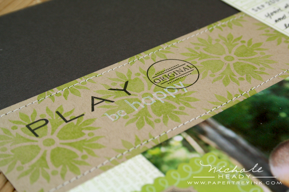 On the left-side of the layout, you might have noticed the patterned strip. I achieved this by stamping the woodgrain first, masking the edge with a post-it note and adding the text in the opposing direction. It really creates a cool effect.