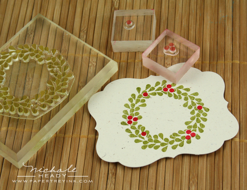 And here's a little trick. After you stamp the berries one, rotate your stamp about 45-degrees and stamp again without re-inking. The faded look of the second stamping helps to make the wreath more realistic.