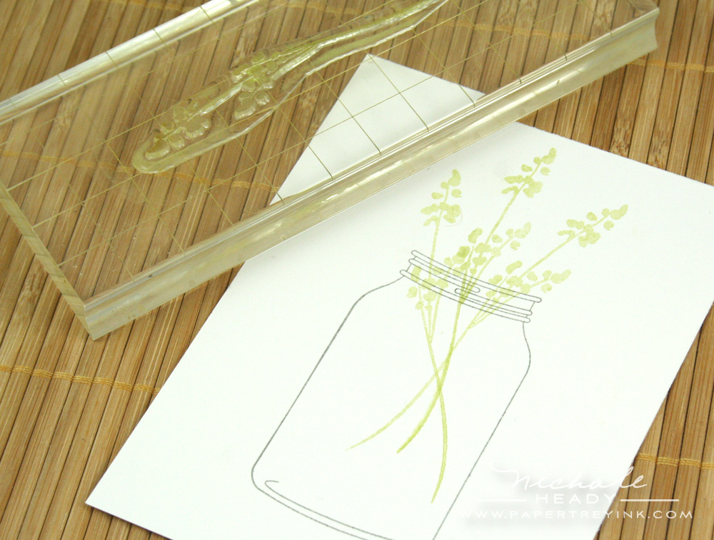 I stamped the jar in a subdues Smokey Shadow onto white cardstock. I then added the "stems" from Larger Than Life using Spring Moss ink.