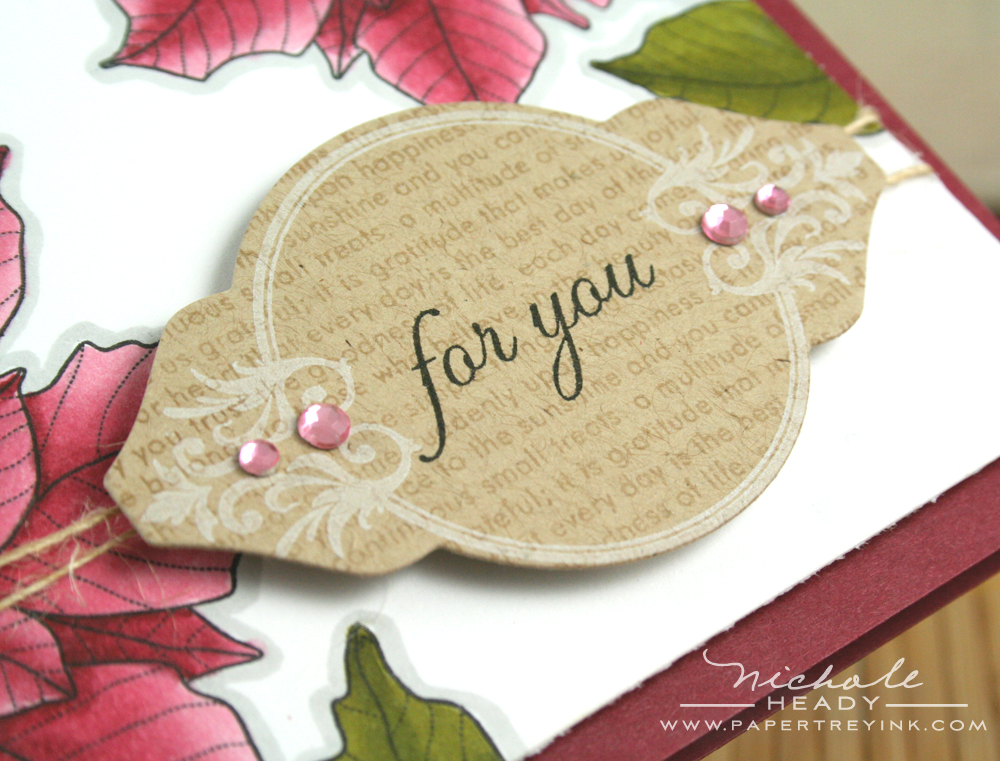 I stamped both the small and large poinsettias onto Berry Sorbet cardstock using Vintage Cream ink. I also swiped the ink pad around the edges of the cardstock to help soften everything.