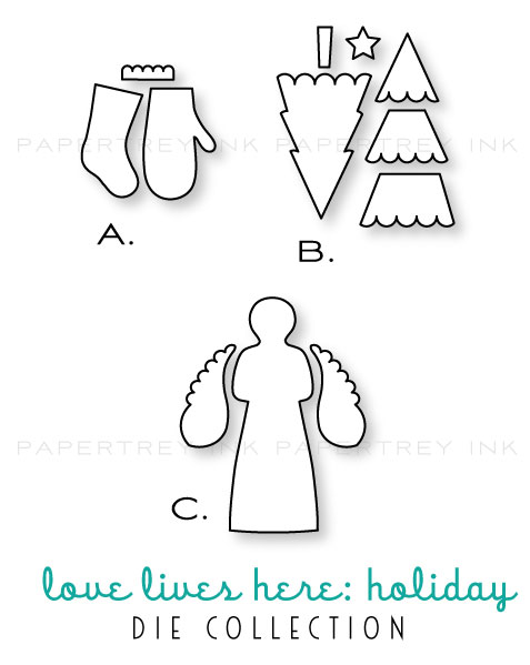 - A coordinating die collection will be available for sale separately, retailing for $16. It includes that will cut out shapes for the stocking, mitten, scalloped border, assembled & unassembled trees, star, angel & angel wings. The approximate dimensions of the three dies are as follows: 1-3/4" x 1-3/4" (A), 2-1/4" x 2-1/2" (B), 2-1/4" x 3" (C).