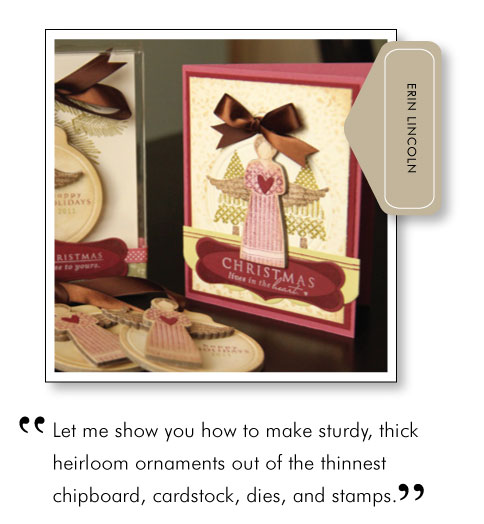 The angel is die-cut fromKraft cardstock and the coordinating image is stamped with Vintage Cream ink.