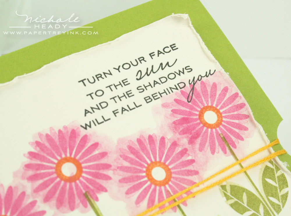 I started with a block of Vintage Cream cardstock and stamped the stems along the bottom using Ripe Avocado ink. Each of the stems is stamped a second time, slightly off kilter from the original impression, without re-inking to give a shadow effect. The flowers were stamped in Raspberry Fizz ink followed by the centers in Orange Zest. I used a watercolor brush and water to dilute the ink around the flowers, giving it an artsy look.