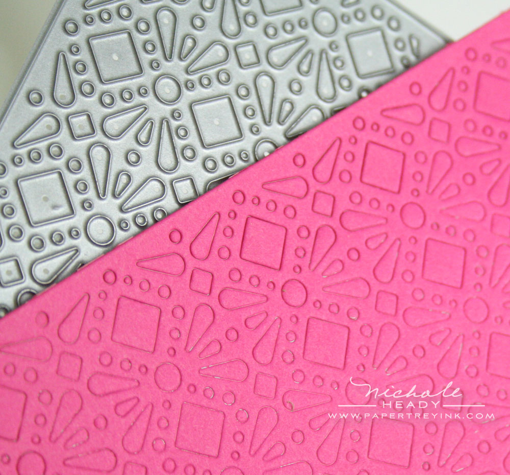 I used the new Lace Impressions die with Raspberry Fizz cardstock, running it just once through my machine to take advantage of its impression capabilities.