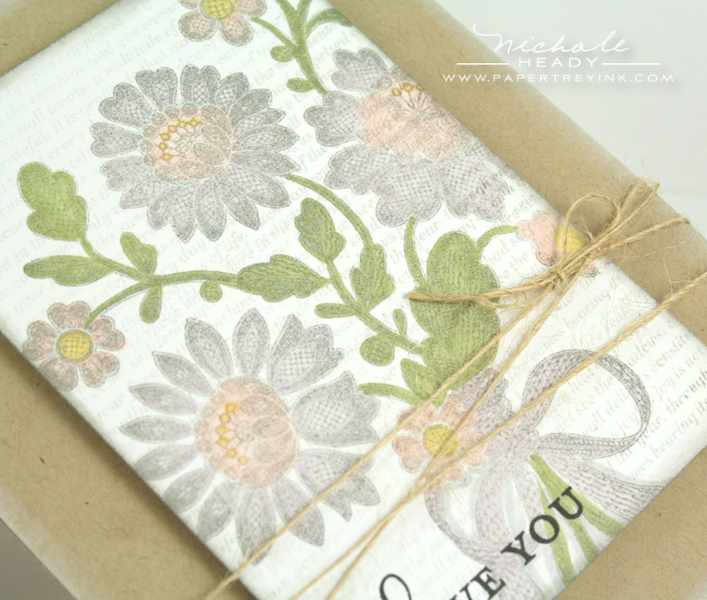 I added the "Love You" sentiment from the new Script Sentiments set (more about this later on in the week) with True Black ink. The focal point was adhered to a Kraft card base that had been edged with Fresh Snow ink.