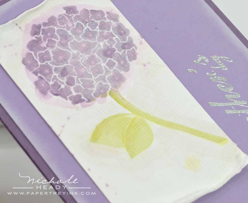The sentiment, also from Happy Hydrangeas, was placed vertically and heat embossed with Silver Filigree Embossing Powder onto a block of Winter Wisteria cardstock. The edge of the block was swiped with a Fresh Snow ink pad to help soften it. All of this was mounted onto a Plum Pudding card base.