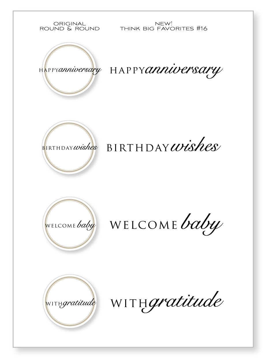 - Think Big Favorites #16 contains a total of 4 images. The "Happy Anniversary" measure 3-1/4" x 3/8". The "Welcome Baby" sentiment measures 3-1/4" x 1/2". The "With Gratitude" sentiment measures 3-1/4" x 3/4". The "Birthday Wishes" sentiment measures 3-1/4" x 1/2".