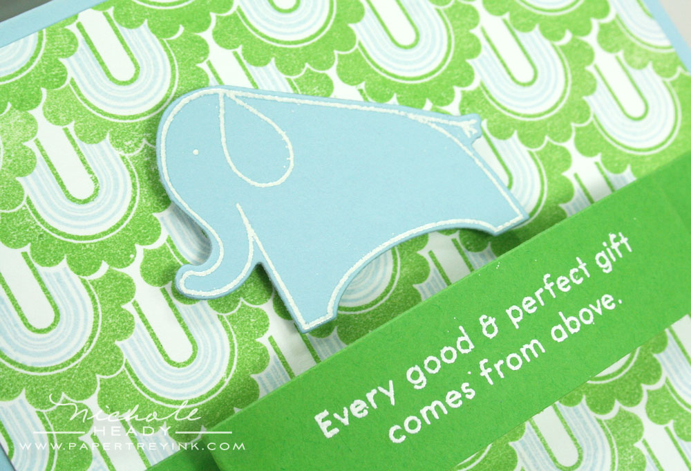 I used the new Bitty Baby Blessings die to cut out the elephant from Spring Rain cardstock. I then heat embossed it with the coordinating image from Bitty Baby Blessings stamp set using White Filigree Embossing Powder. Having this die really opens up so many more design options, which I love.
