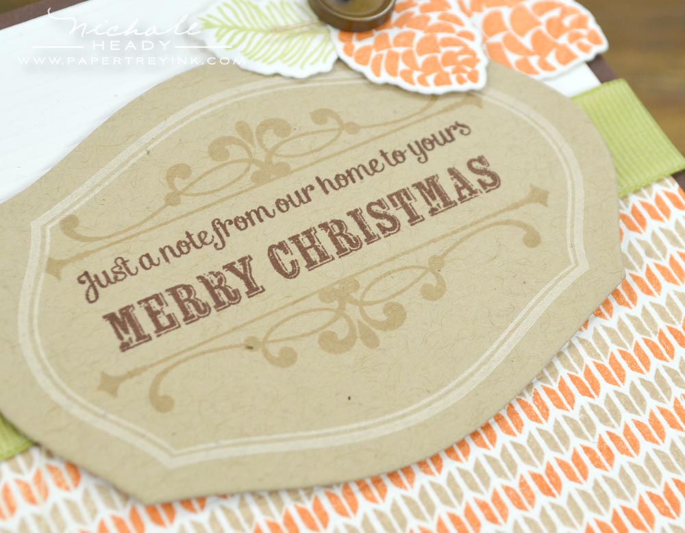 On Vintage Cream cardstock, I stamped a variety of the pinecone boughs in Ripe Avocado ink, stamping twice with each inking to get a variety of intensities. The pinecones were added in Dark Chocolate ink. The sentiment was stamped onto a strip of vellum using Black Noir ink.