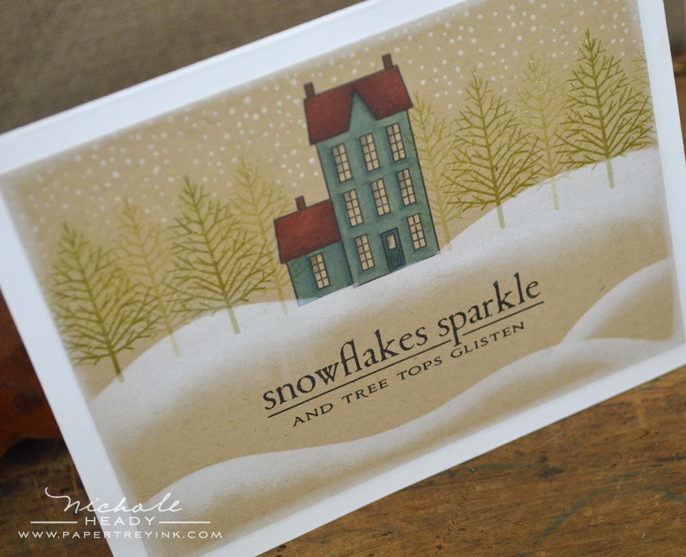 I stamped the house from Winter Hills in Black Noir Palette ink and colored it with Copic markers. I then added the trees on either side using Ripe Avocado ink, stamping twice with each inking to achieve to intensities. There is a small snow flurry cluster included in the set, which I used with Fresh Snow ink just above the tree line. I added a bit of shimmer to the trees with a Sakura Gelly Roll pen.