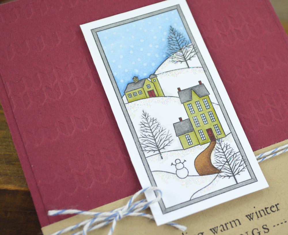 I stamped the scene with Black Noir ink onto white cardstock and colored it with Copic markers. I added just a bit of glitter to the top edges of the hills with a 2-way glue pen and Prisma Glitter. The Scarlet Jewel background of the card was impressed with the new Striped Sweater impression plate (more about this later on in the week!).