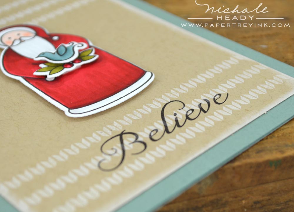I added knit stripes to the bottom and top edges of the Classic Kraft card front using Fresh Snow ink. The "Believe" sentiment was added with True Black ink.
