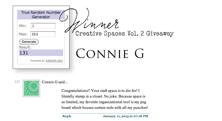 Congratulations, Connie G! Please email customer service with your full name & mailing address so we can pass it along to Creating Keepsakes and they will mail out your FREE copy of this special issue very soon! Thank you to everyone who shared their storage tips! I hope many of you will go out and pick up a copy of this for yourselves! You deserve it!