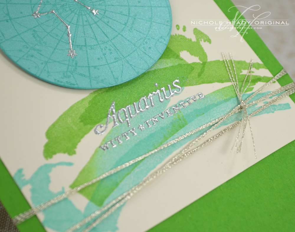 At the bottom of the Vintage Cream card from, I stamped strokes from Watercolor Wonder using Hawaiian Shores & New Leaf inks. I then heat embossed the zodiac title with Silver Filigree Embossing Powder.