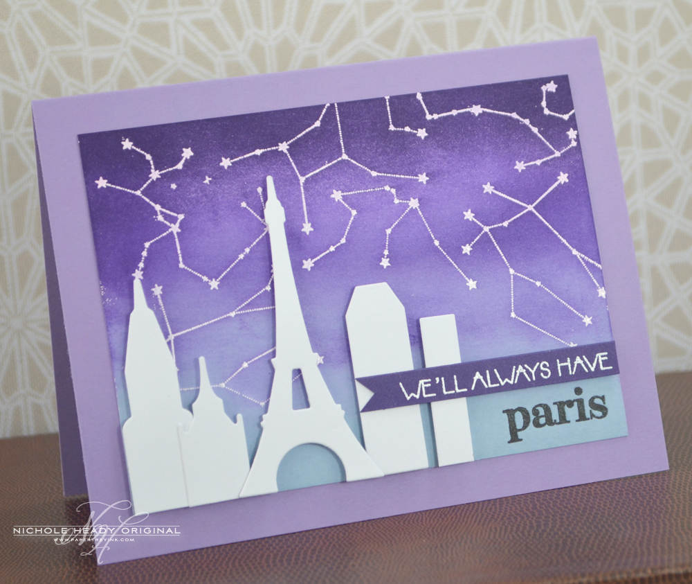 I started by creating the sky. I heat embossed several different constellations from Star Gazer onto white cardstock using White Filigree Embossing Powder. I then sponged Royal Velvet and Spring Rain inks over them creating this pretty ombre look. The buildings were die-cut from white cardstock and assembled together to form a city skyline.