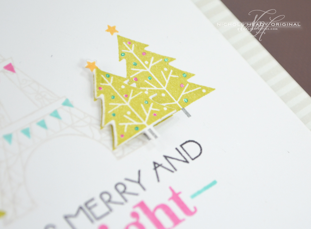 The Eiffel Tower was stamped in Soft Stone. I placed a post-it note on either side of the tower to serve as a mask and stamped the pennant banner from the set in both Raspberry Fizz and Hawaiian Shores. Note the star at the top of the Eiffel Tower, making it look like a *Christmas tree*.