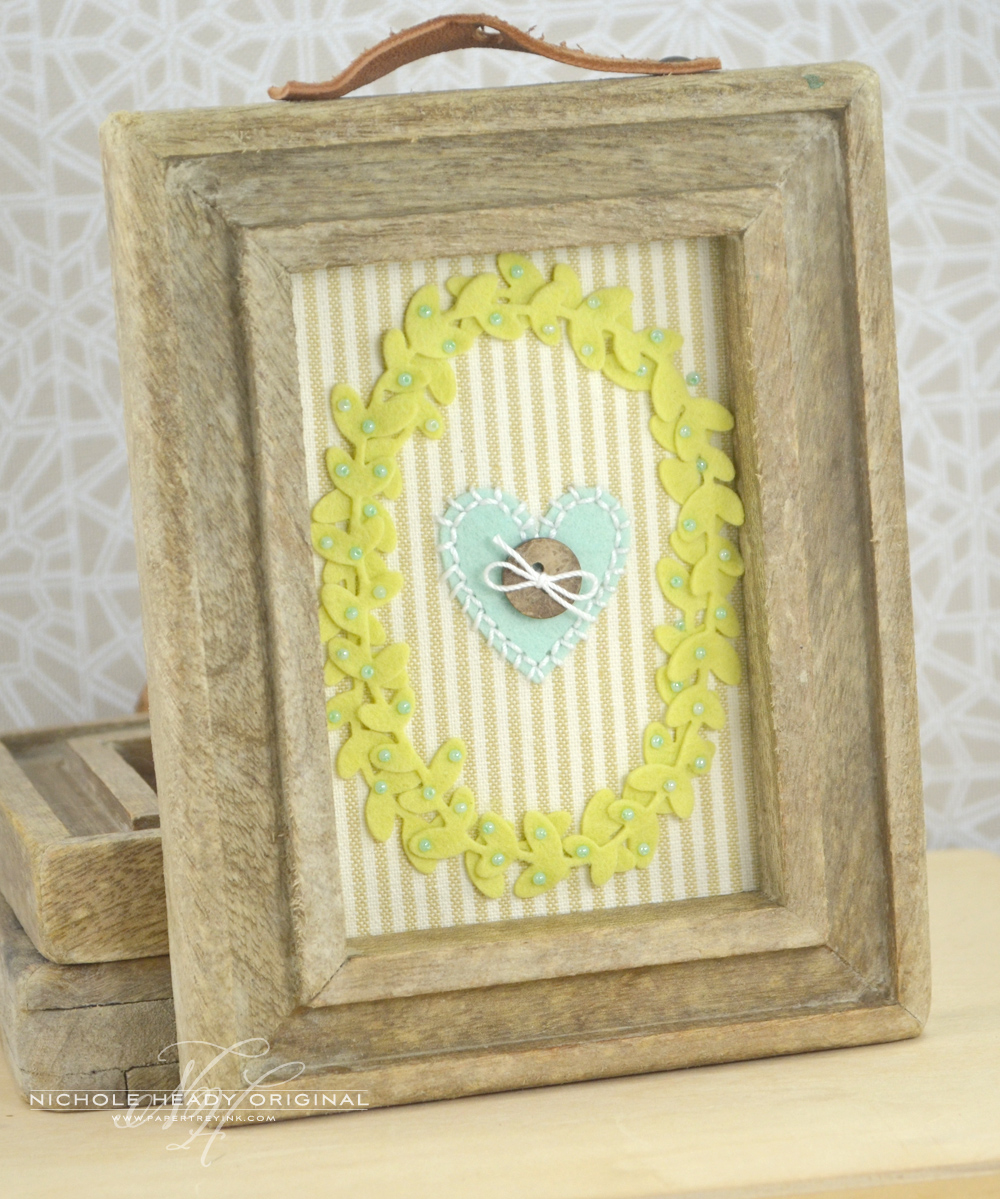 - OTHER: Rustic Wreath die, Coffee Cozy Details die (heart), Limeade Ice & Aqua Mist felt, white crochet thread, wooden button, seed beads, frame (Coldwater Creek), striped fabric (Waverly)
