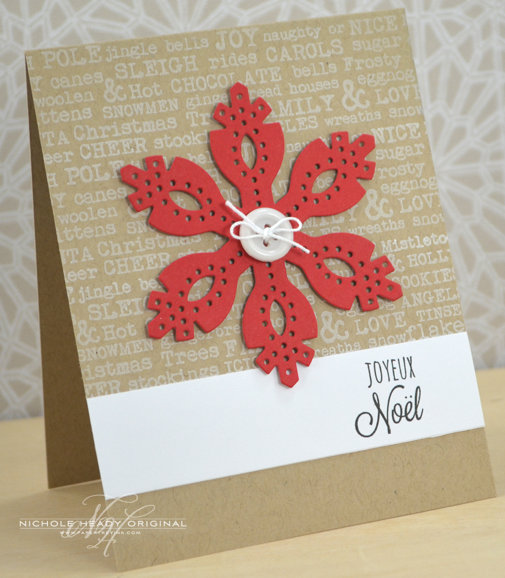 The snowflake was die-cut from Pure Poppy cardstock and adhered in place with small bits of foam tape. A white button tied with crochet thread was added to the center with glue dots.