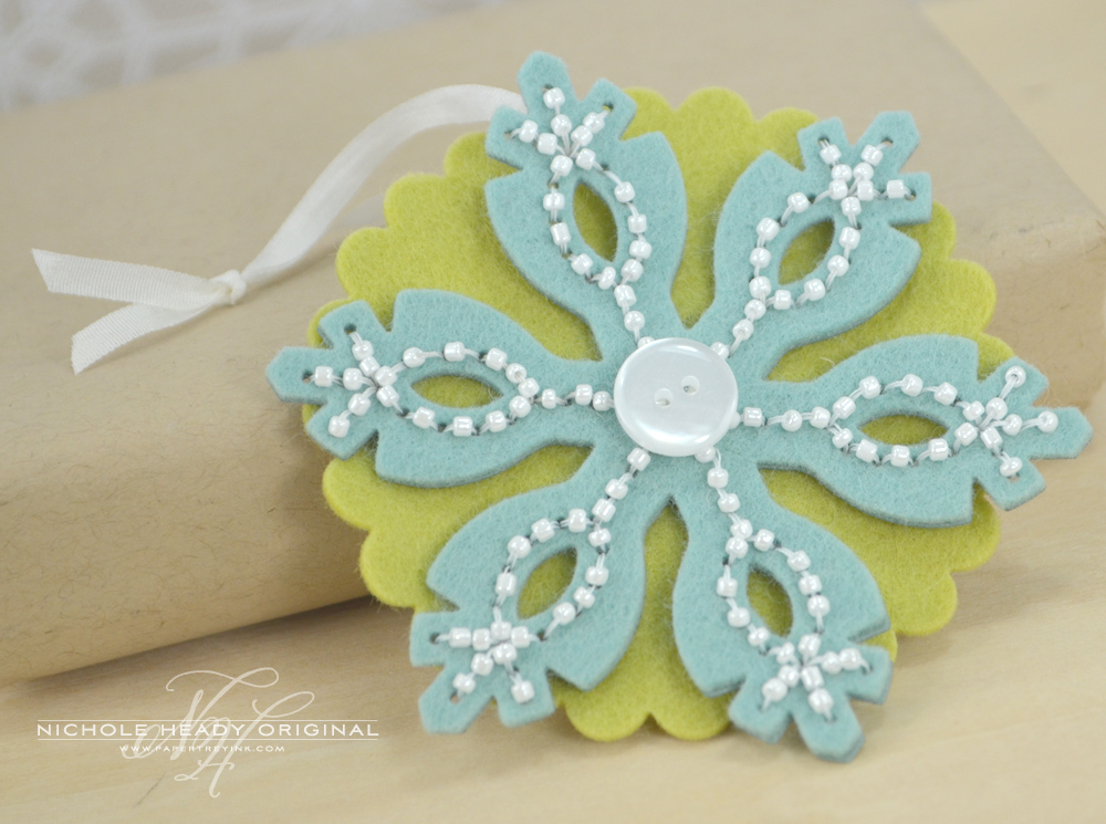 - OTHER: Stitched Snowflake die, Limitless Layers 2-1/2" Circle die, Ocean Tides & Simply Chartreuse felt, 1/8" Silk Ribbon, button, seed beads, beading thread, Scor-tape