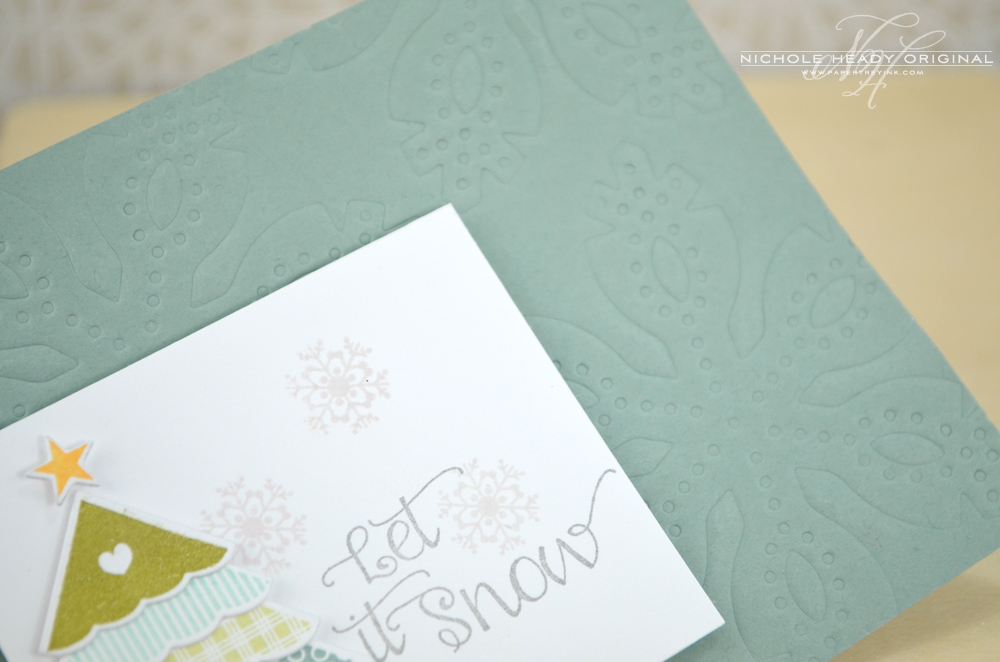 On the background of the card I impressed the new Stitched Snowflakes die a few times. I love the subtle detail that this adds.