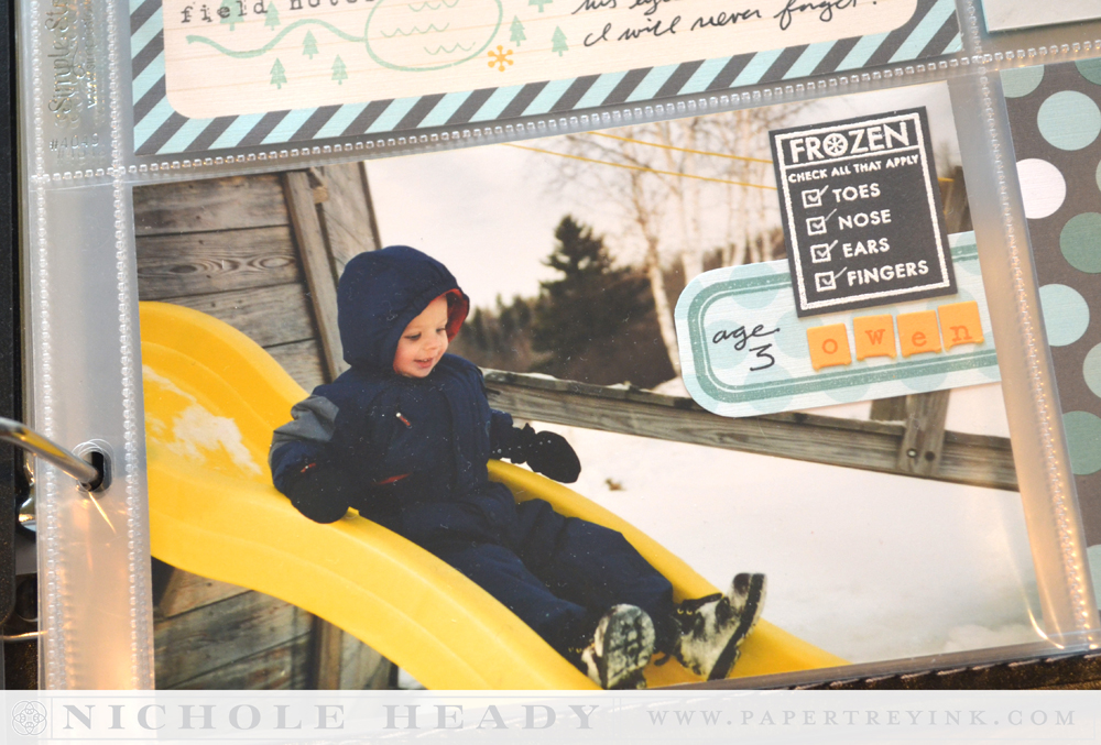 I accented the side of the photo with this adorable "Frozen" checklist image. It's heat embossed onto Smokey Shadow cardstock. I created a label by stamping the frame from Summer Camp onto one of the polka-dotted journal cards for this month and then cutting it out. This is accented with some Type Strips II letters stamped in Orange Zest.