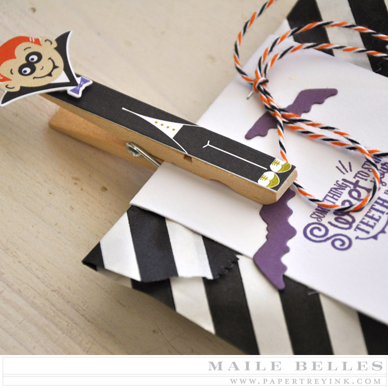 Create adorable treats, wraps, cards, and favors with the Halloween Pin-Ups mini kit, designed to turn simple clothespins into an assortment or spooky-cute Halloween characters! Frank, Vlad, Helga, and Skelly are sure to bring a smile to your little trick-or-treaters’ faces — not to mention yours when you see how quick and easy this kit makes it to create adorable projects. Use the stamps, dies, and papers included in the kit to embellish the included clothespins, but no fear, they’ll be right at home on your Halloween cards and tags too!