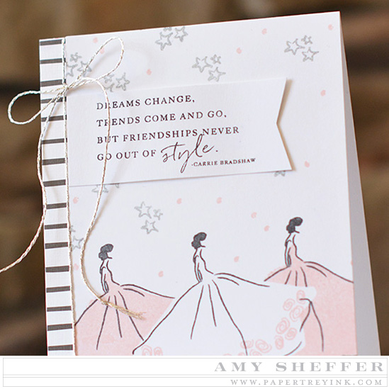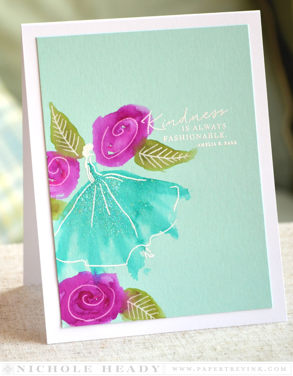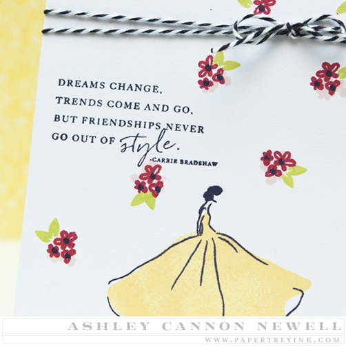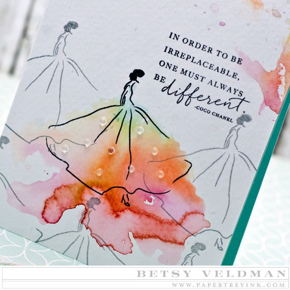 Isn't everything just gorgeous? What I love most about this set is that you can really keep things simple with the overall design/layout, and then go to town with techniques and color on that beautiful dress! I know so many people that would love to make cards for with this collection! It's certainly going to get a lot of mileage here!