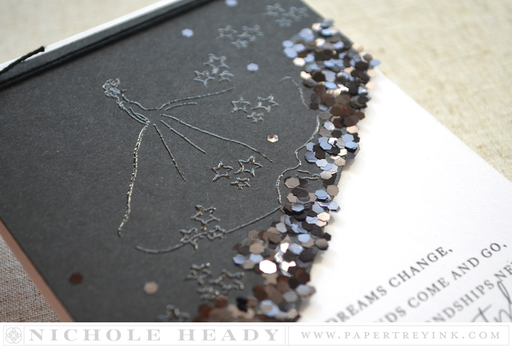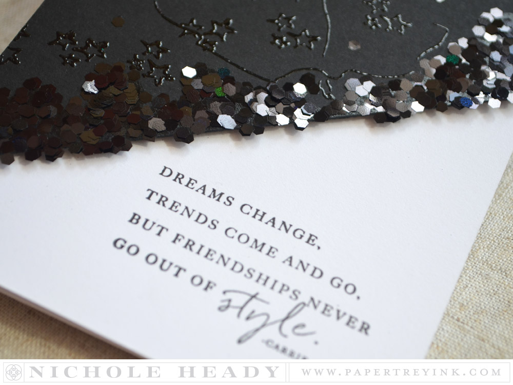 I used black embossing powder on black cardstock with the dress and a scattering of stars for a unique look. A few dabs of Glossy Accents along the edge of the angled panel allowed me to go just a *little* crazy with some chunky glitter.