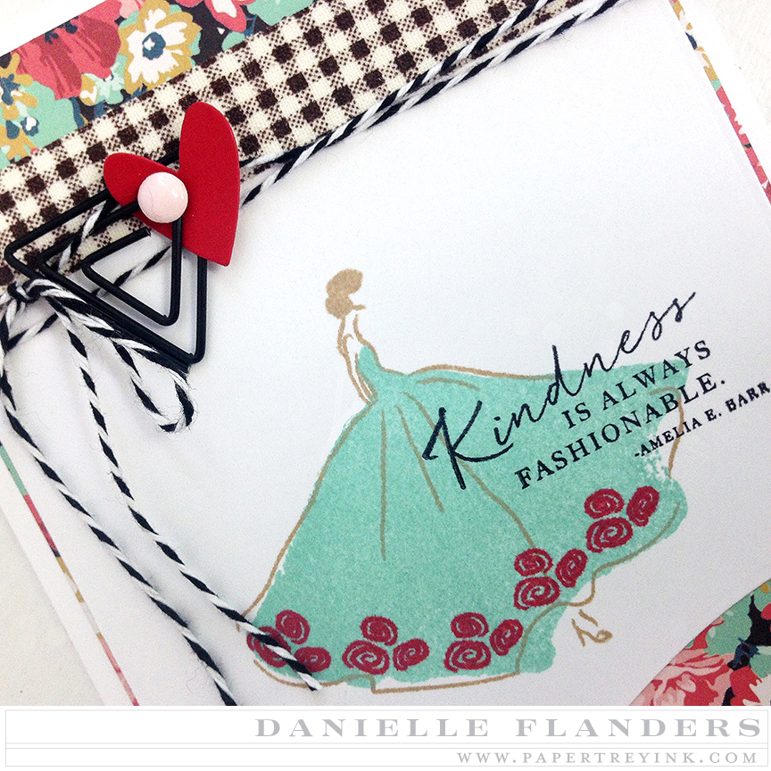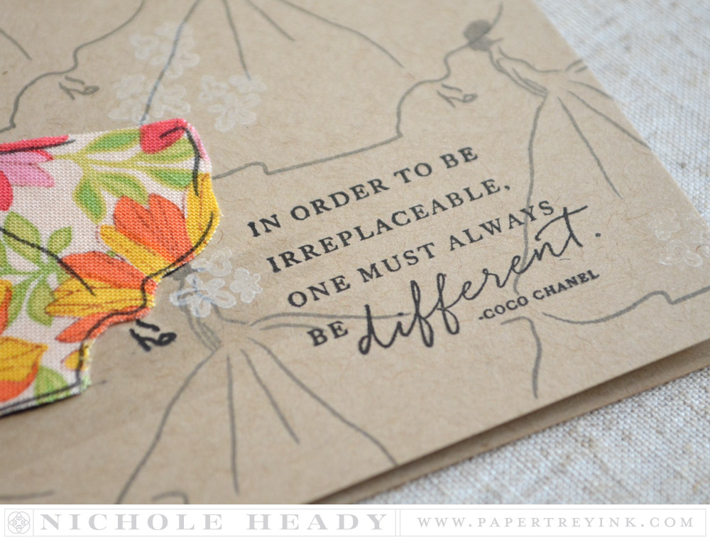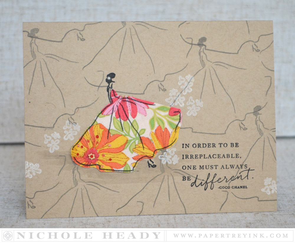 I stamped the model again directly onto fabric and trimmed out the dress portion, adhering it in place on the model stamped in black. Have fun experimenting with different pattern scales on your fabric! I also stamped a few Vintage Cream flower clusters around the model to help create emphasis.