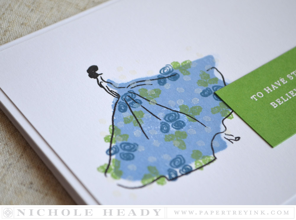 I stamped the model in True Black then stamped the dress in Blueberry Sky, making sure it was slightly *off*. I then was able to go back in with a few accents in Enchanted Evening, New Leaf and Fresh Snow.