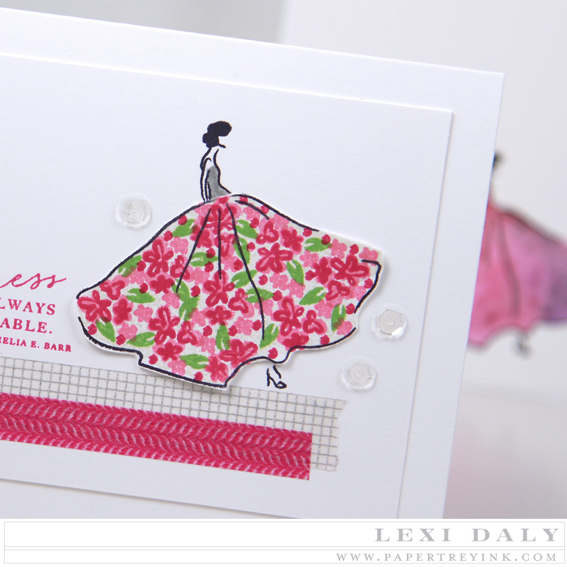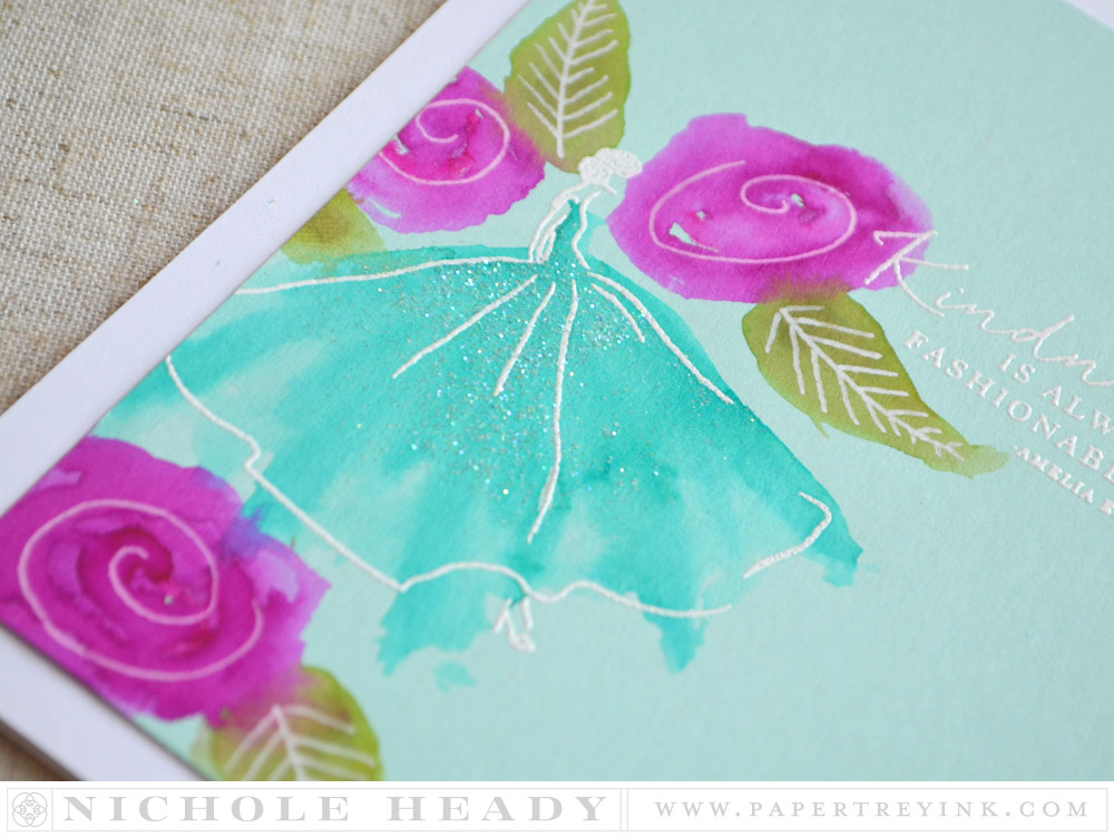 I stamped the dress in VersaMark and heat embossed it in white. I then colored it with a marker and went back over it with a watercolor brush.
