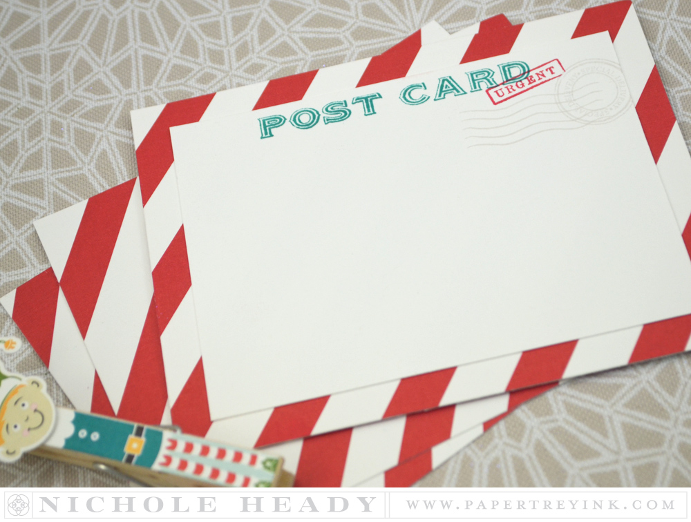 I designed these postcards that could be left throughout the month of December with notes from our elf. I was able to create an entire North Pole scene by using the elements in the Petite Places: Holiday Lane set. I also added the air mail arrow from Postmarks. Note that the focal point layer was adhered to our new Pure Poppy + White Basics diagonal stripe paper for that perfect postcard look.
