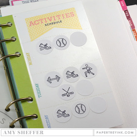 Amy says, "The past couple of weeks have been super busy, so my weekly pages are crowded. I wanted to highlight the semi-finals and championship basketball games my younger son played in, so I did that with the basketball icon. The icons are a great way to make something stand out, plus they're cute and colorful! Stop by and check out the card I created using these images too!"