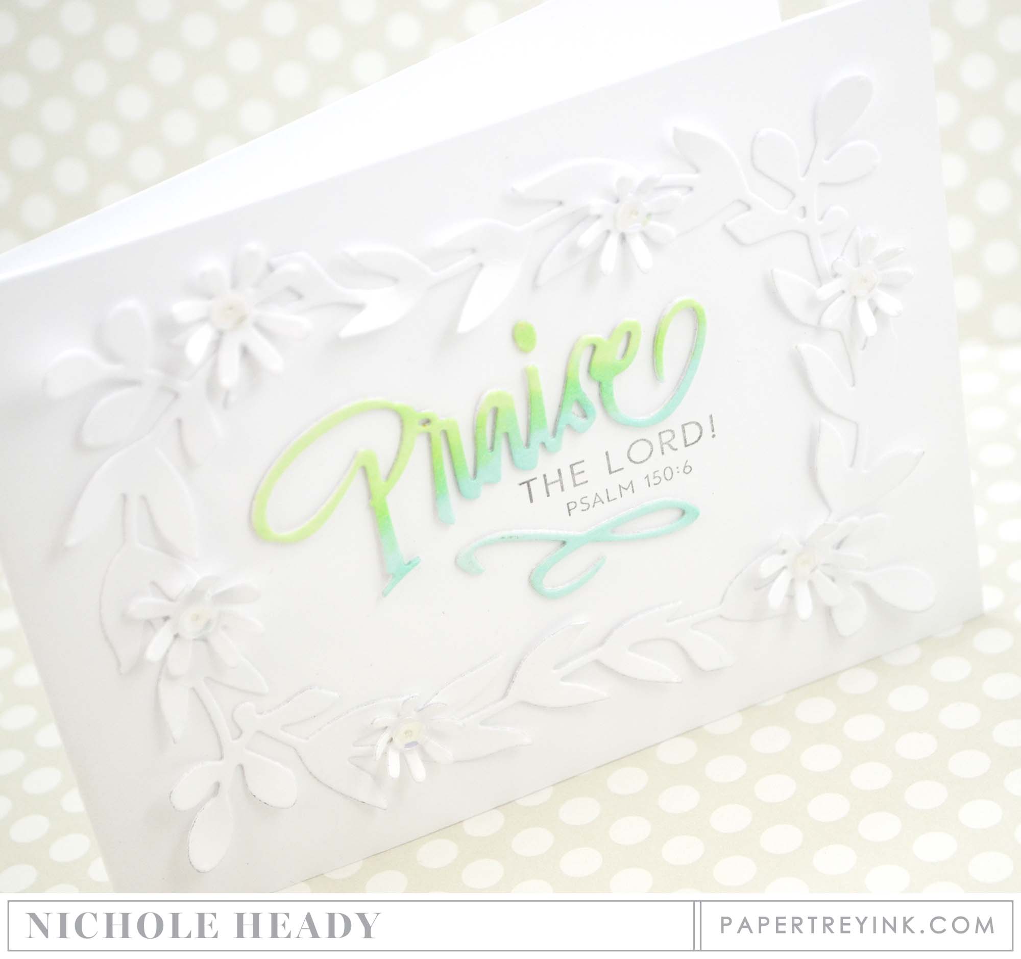 For the sentiment, I die-cut the word "Praise" three times from white cardstock and adhered the layers together for dimension. Same thing with the flourish. These were colored with Copic markers, blending the two colors together in the middle. The companion sentiment was stamped in Charcoal Palette ink.