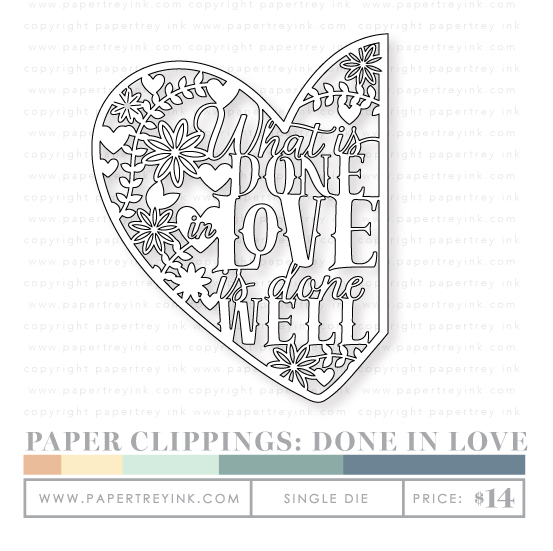 - The coordinating Paper Clippings: Done In Love die will be available for sale separately, retailing for $14. This is a single die. 4-1/8” x 5-1/8”
