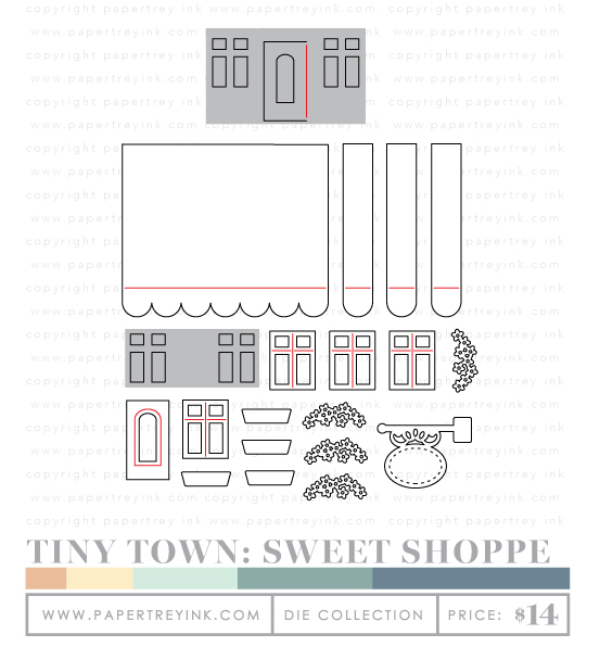 - Tiny Town: Sweet Shoppe contains a set of 20 dies. Awning (2-5/8” x 2-1/4”), awning stripes (3/8” x 2-1/4”), window frames (5/8” x 3/4”), flowers (7/8” x 3/8”), door (1/2” x 1”), window boxes (5/8” x 3/16”), sign (1-1/4” x 1”)