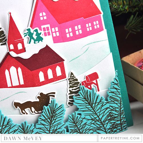 There's something nostalgic about cards featuring snowy village scenes. Perhaps it's because we imagine ourselves inside one of the little cottages, or maybe it reminds us of how things used to be. Here I have used some classic vintage colors to bring back that feeling of days gone by.