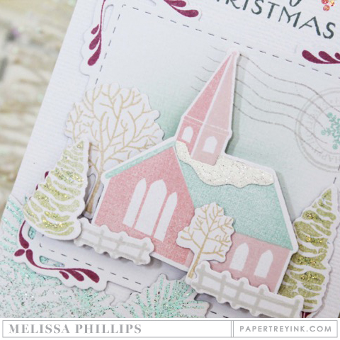The church was added in Sweet Blush, Melon Berry and Soft Stone. Using Copic markers I added a bit of a glow to the windows, just to make it look warm and inviting.