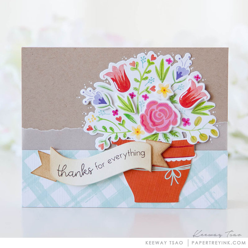 - Die cut pot, bouquet and a few extra flowers from Bloom and Grow PP. Stamp greeting on bottom of bouquet and adhere additional flowers.