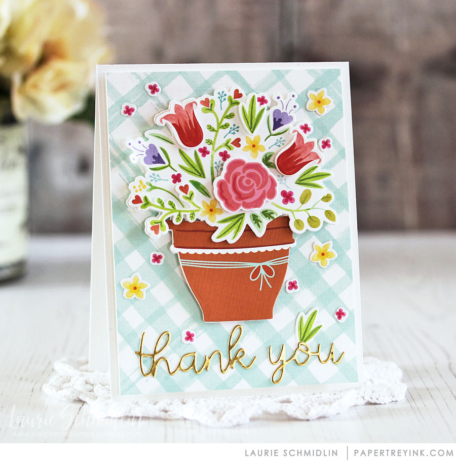 - Die cut a frame using Noted layering dies. Stamp plaid with BB: Super Stripes in Harvest Gold ink. Attach to card front with foam tape. Adhere flower pot in opening.
